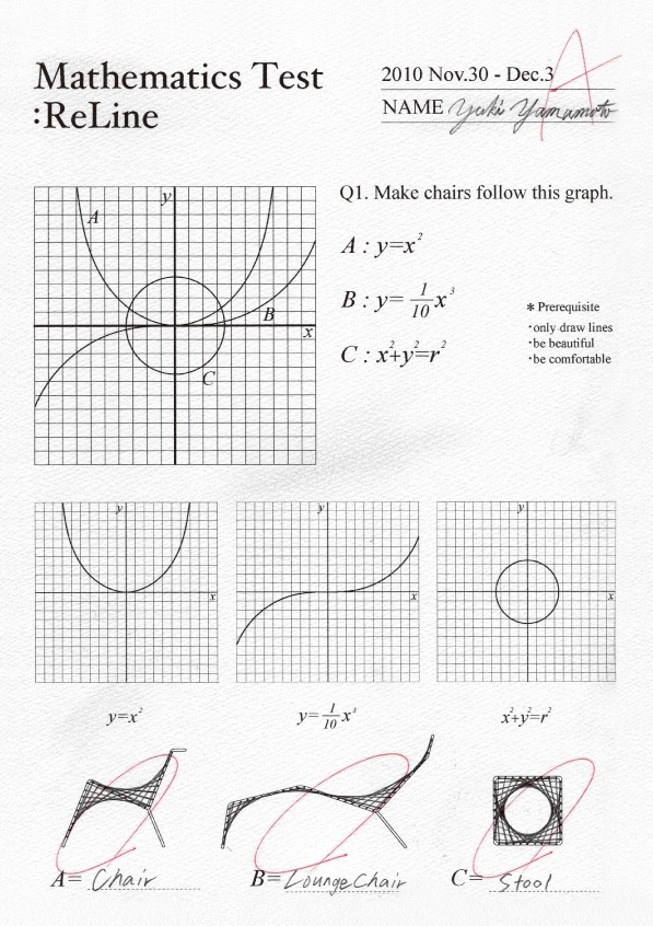TOKYO DESIGN TIDE 2010 の展示用に制作したリーフレット。 モチーフは「引き出しから出て来た数学のテスト」です。 というのも今回制作したReLineの着想の原点が、中学生の頃に数学の授業で見た「直線を少しずつ傾けながら引く事で生まれる曲線」でした。 あの時、教室の中で感じた驚きや気持ちが伝わればと思い、数学のテストをモチーフにリーフレットをデザインしました。
